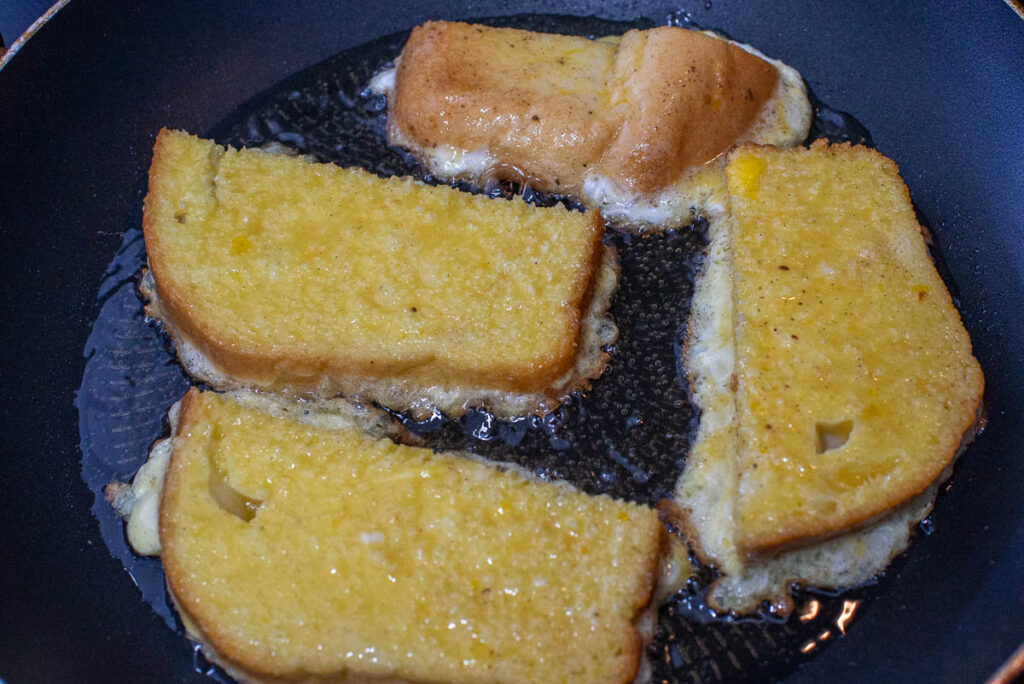 2Dip 4 to 5 bread slices, one at a time into the egg mixture. Shake off the excess egg mixture from the bread, and place the bread slices onto the hot skillet. Do that till you use up all the bread. You might have few slices left.